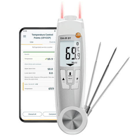 – Testo 104-IR termometreler; özellikle gıda firmalarının mal kabulünde, tek tek gıdaların veya tüm gıda paketlerinin yüzey sıcaklıklarının temassız bir şekilde ölçülmesi için idealdir. Limit değerin aşılması veya altına inilmesi durumunda kesin kontrol için batırma probu ile ürün iç sıcaklığı ölçülebilmektedir.